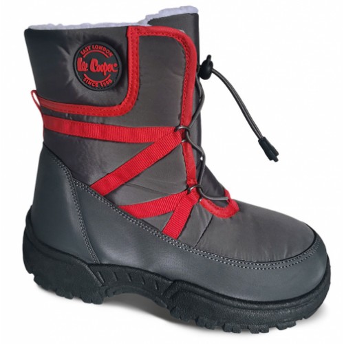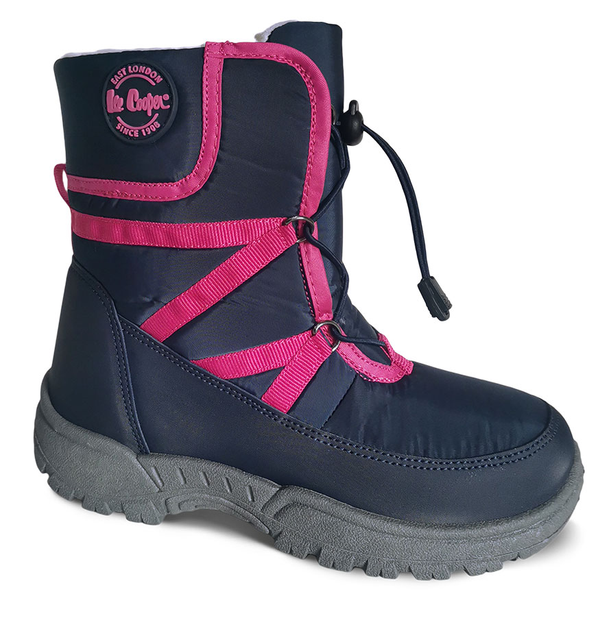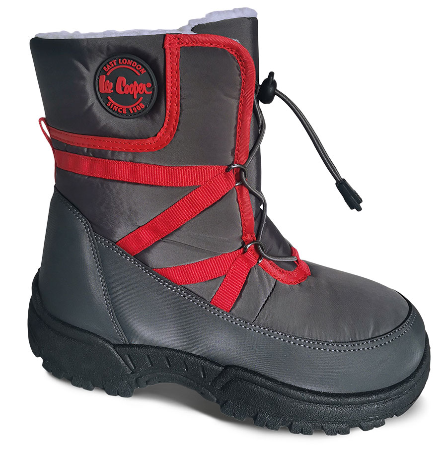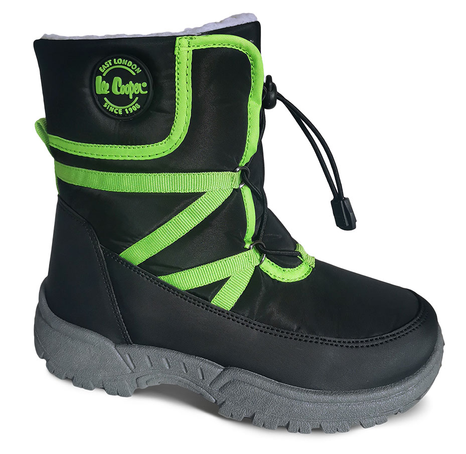 Wysokie, dziecięce śniegowce z elastyczną sznurówką.