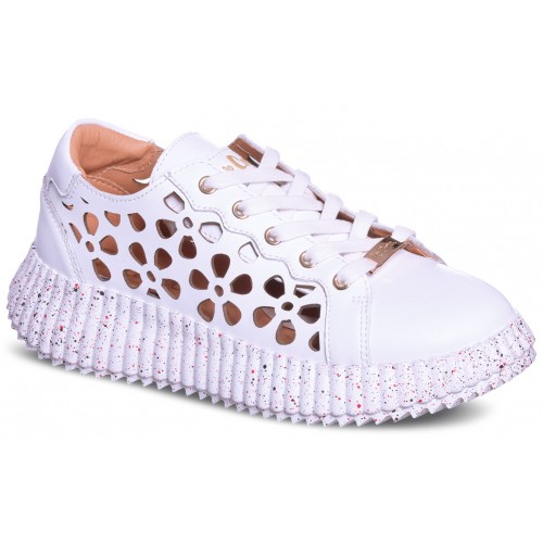Modne, skórzane trampki ozdobione kwiatowym wyciętym wzorem.