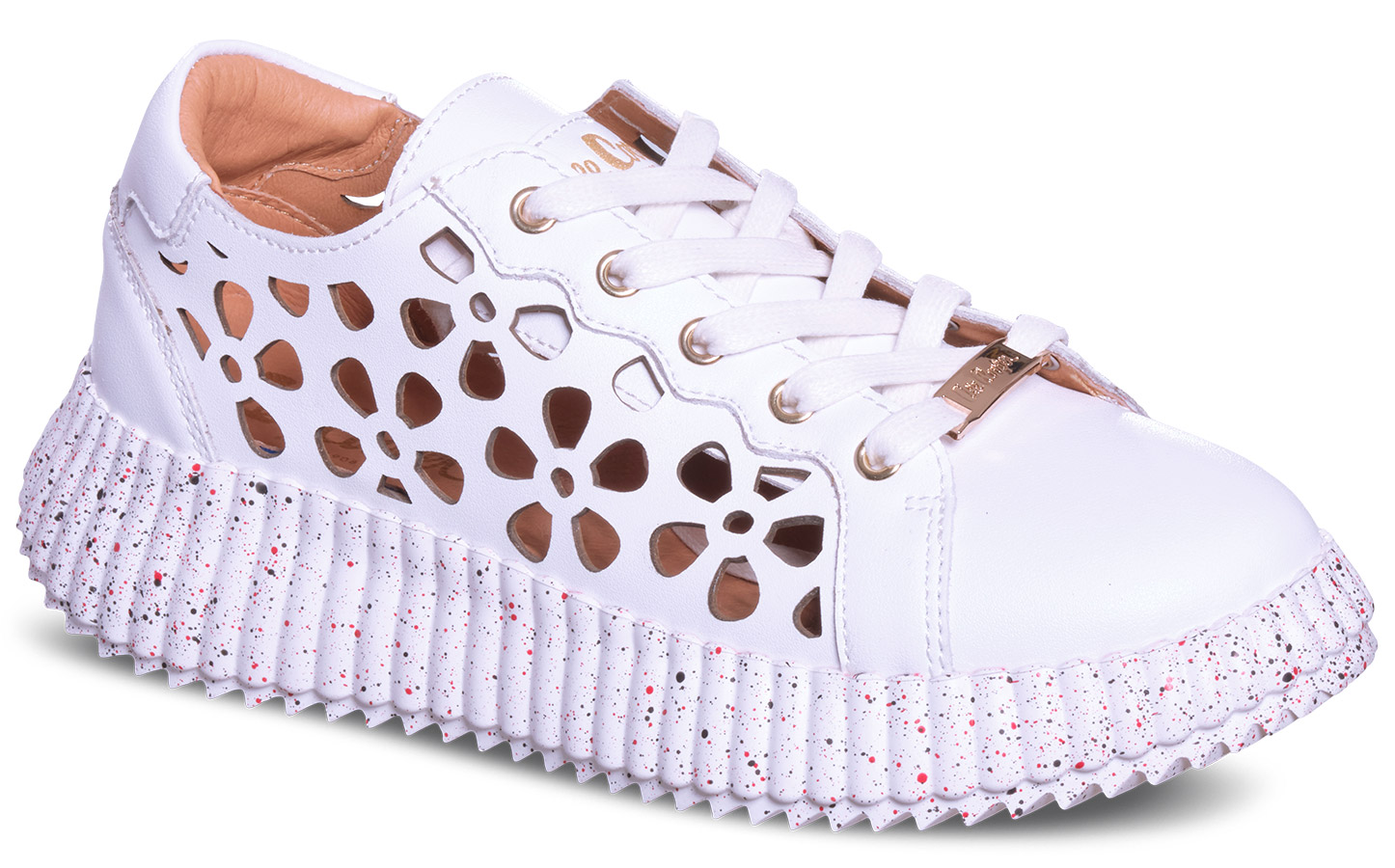 Modne, skórzane trampki ozdobione kwiatowym wyciętym wzorem.