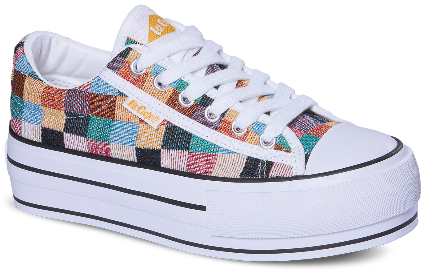 Wygodne, materiałowe trampki na grubszej podeszwie.