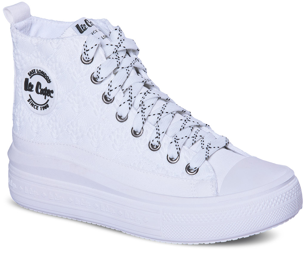 Modne wysokie trampki za kostkę z gumowym noskiem wykonane z naturalnego materiału typu canvas.